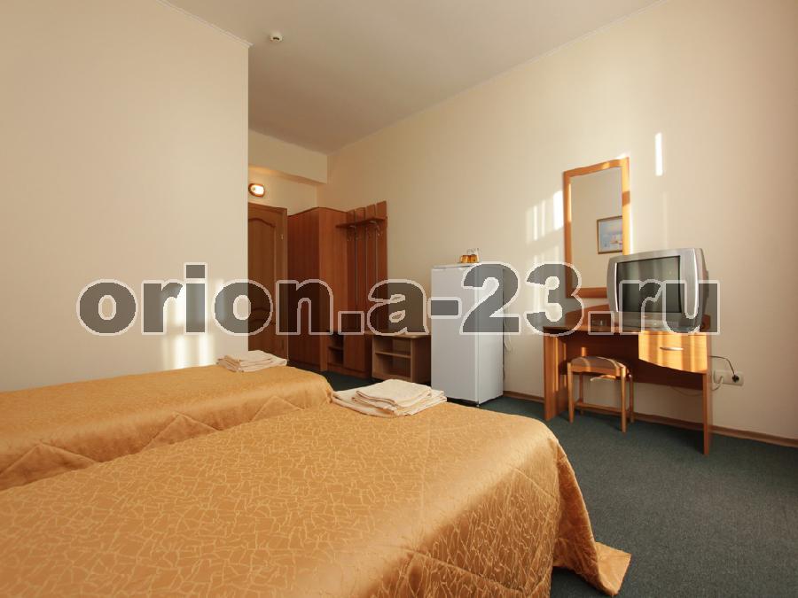 две односпальные кровати, стол, стул, тумочка, шкаф для одежды, телевизор, холодильник, сплит-система, санузел (душевая кабина, туалет, умывальник). В каждом номере балкон с видом на море. Возможна установка одного дополнительного места. Площадь номера 22-24 кв. м.